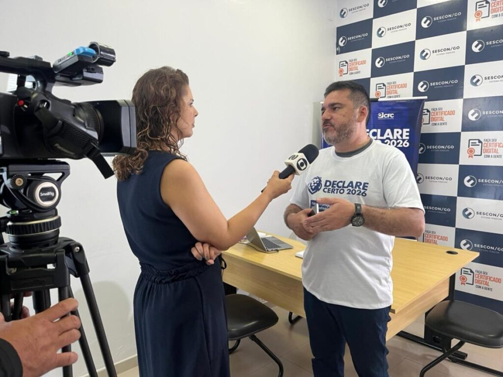 Presidente da FENACON concede entrevista para a TV Anhanguera durante o “Dia D” do Declare Certo em Goiânia