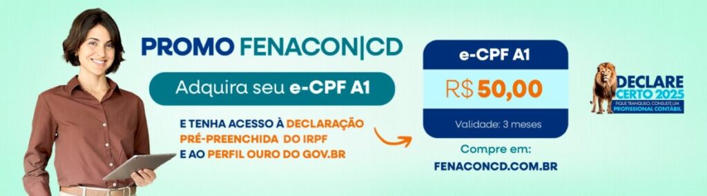 Chegou a oportunidade perfeita para garantir o seu certificado digital! A FENACON|CD está com uma promoção especial: e-CPF A1 com validade de 3 meses por apenas R$ 50,00!