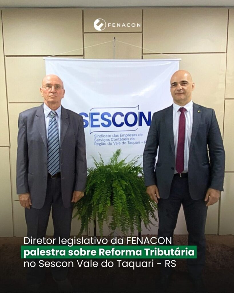 Nesta terça-feira (16), o diretor legislativo da FENACON, Diogo Chamun, participou da cerimônia de posse da nova diretoria do Sescon Vale do Taquari, em Lajeado, Rio Grande do Sul. Após a solenidade, o representante da FENACON palestrou sobre os desafios e oportunidades da Reforma Tributária. A gestão 2026/2027 será presidida pelo contador e proprietário da […]